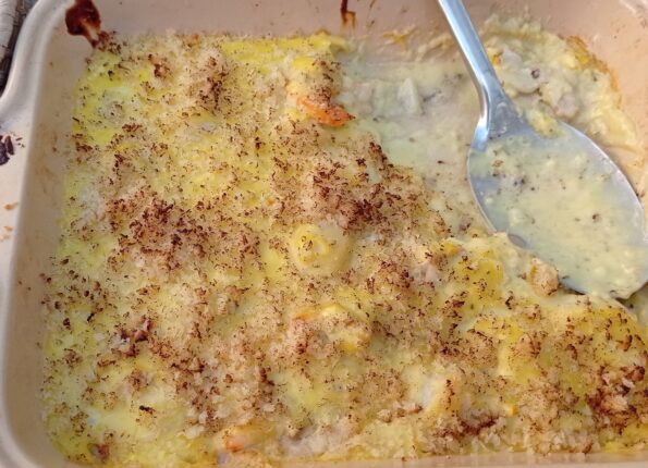 Mix the breadcrumbs in the melted butter. Sprinkle over the dish. Place in the oven. Cook for 15 minutes. Then brown under the grill.