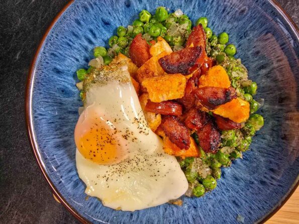 This version from the Basque Country, with peas and chorizo recipe is hearty, comforting, and full of flavour, combining crispy bread, chorizo, sweet peas, and fresh mint.