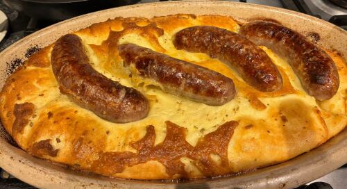 Put the toad in the hole back into the oven and bake for a further 30-40 minutes. It’s ready when the sausages have cooked and the batter has risen, crisped up and turned a lovely golden colour.