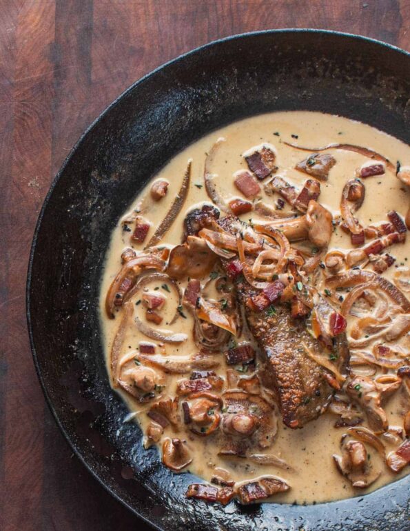 The Best Liver Recipe is made with tender veal liver, caramelized onions, and salty bacon in a creamy mushroom sauce. It’s a one-pan meal idea that can be served on sour dough toast or mashed potatoes.